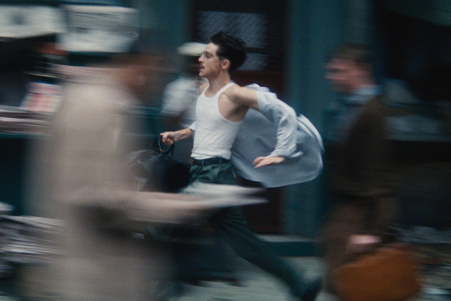 Finally, I want to highlight the attention to detail in Marty Supreme. After watching several Netflix films where everything looks pristine and barely worn, it was refreshing to see a film that went the extra mile to achieve a solid level of realism. For example, when Mauser plays table tennis, he slowly takes off his cardigan, then his tie. He constantly adjusts his trousers. As the games progress, Mauser’s skin begins to glow with a sheen of sweat and then, later, droplets. When he faces a tough opponent and struggles to maintain his composure, his hair keeps falling over his forehead, only for him to adjust it again, and the same with his glasses.