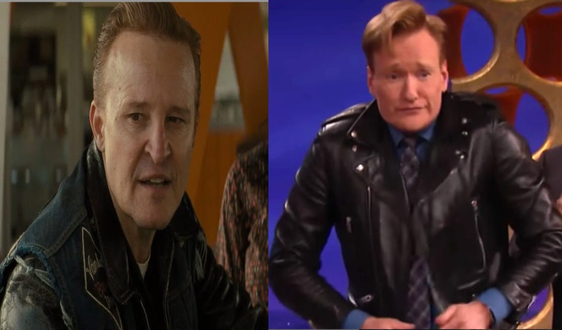 Another thing that detracts from The Bikeriders is casting. No no no, I’m not talking about Tom Hardy’s hard-to-hear American accent, I’m talking about Damon Herriman who plays Brucie, Johnny’s right-hand man. This is an unfair comment, but Herriman, with his hair dyed red and in pompadour style, gave him the unfortunate and uncanny resemblance to talk show host, Conan O’Brien. I could not, for the life of me not think that Conan was a part of the Vandals. The casting director and the production team surely would have seen the resemblance and probably had a bit of a laugh and continued on but they should have pivoted Brucie’s look to avoid such a distraction. I mean, c’mon!